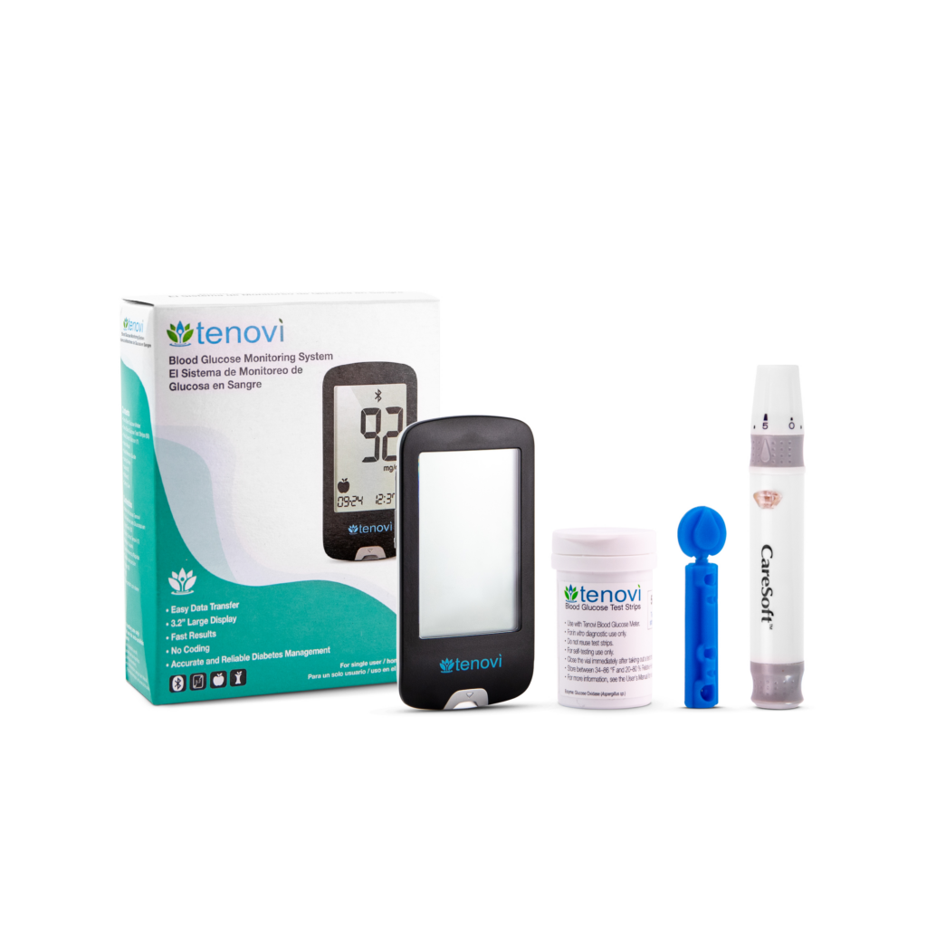 Tenovi BGM comes with a blood glucose meter, control solution, lancing device, 50 test strips, 50 lancets, carrying case, user’s manual, quick start guide and two batteries.