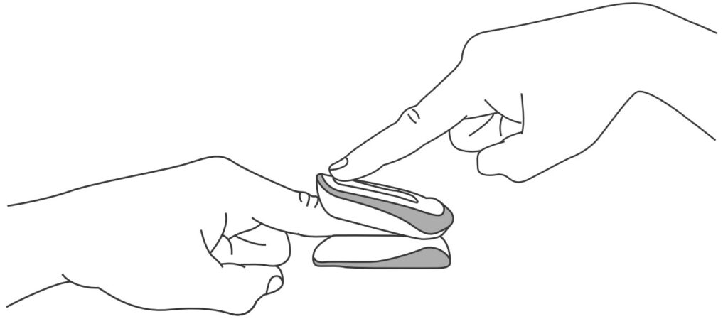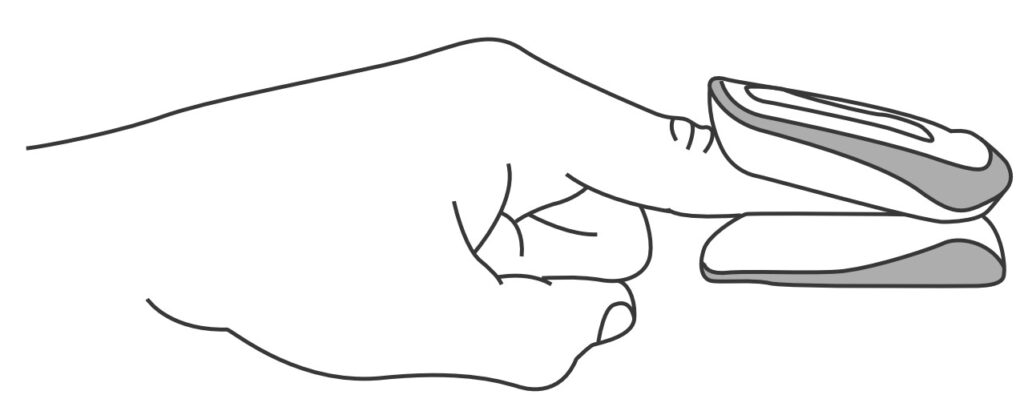 - Be sure to insert finger fully into the device. The finger tip should be pressed to the end of the clip, with the silver dot and red light centered on the fingertip.