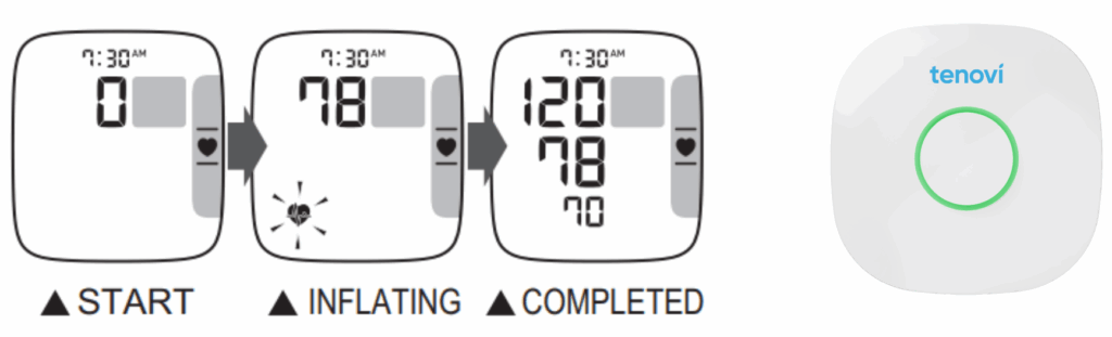 Do not turn off the monitor after measurement is displayed. After the device has transmitted your measurement to the Tenovi Gateway, the device will turn off on it’s own. If you would like to take another measurement, wait for the screen to turn off, then click the Start/Stop button.